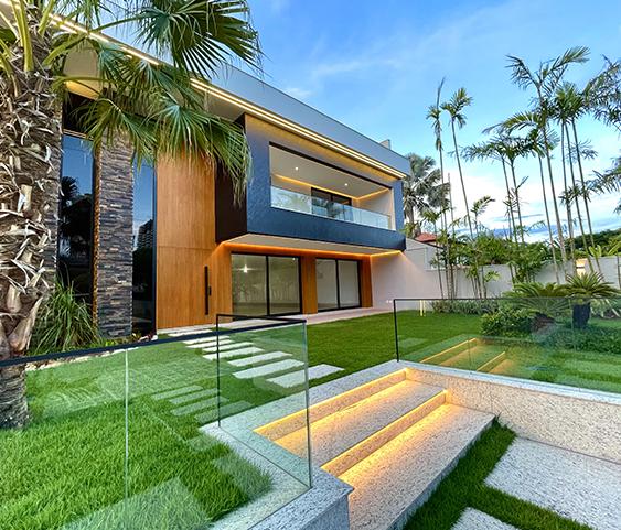 A casa conta com 420m² de área construída e quatro suítes, além de ser totalmente automatizada com controle por comando de voz para diversas funções, como acionar a cascata da piscina e o controle de iluminação.